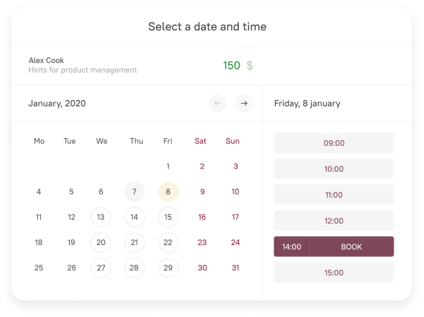 Contact - we will offer a solutionWidget with “Book” button can be located on your Cabinet landing page or embedded onto your website or social media network